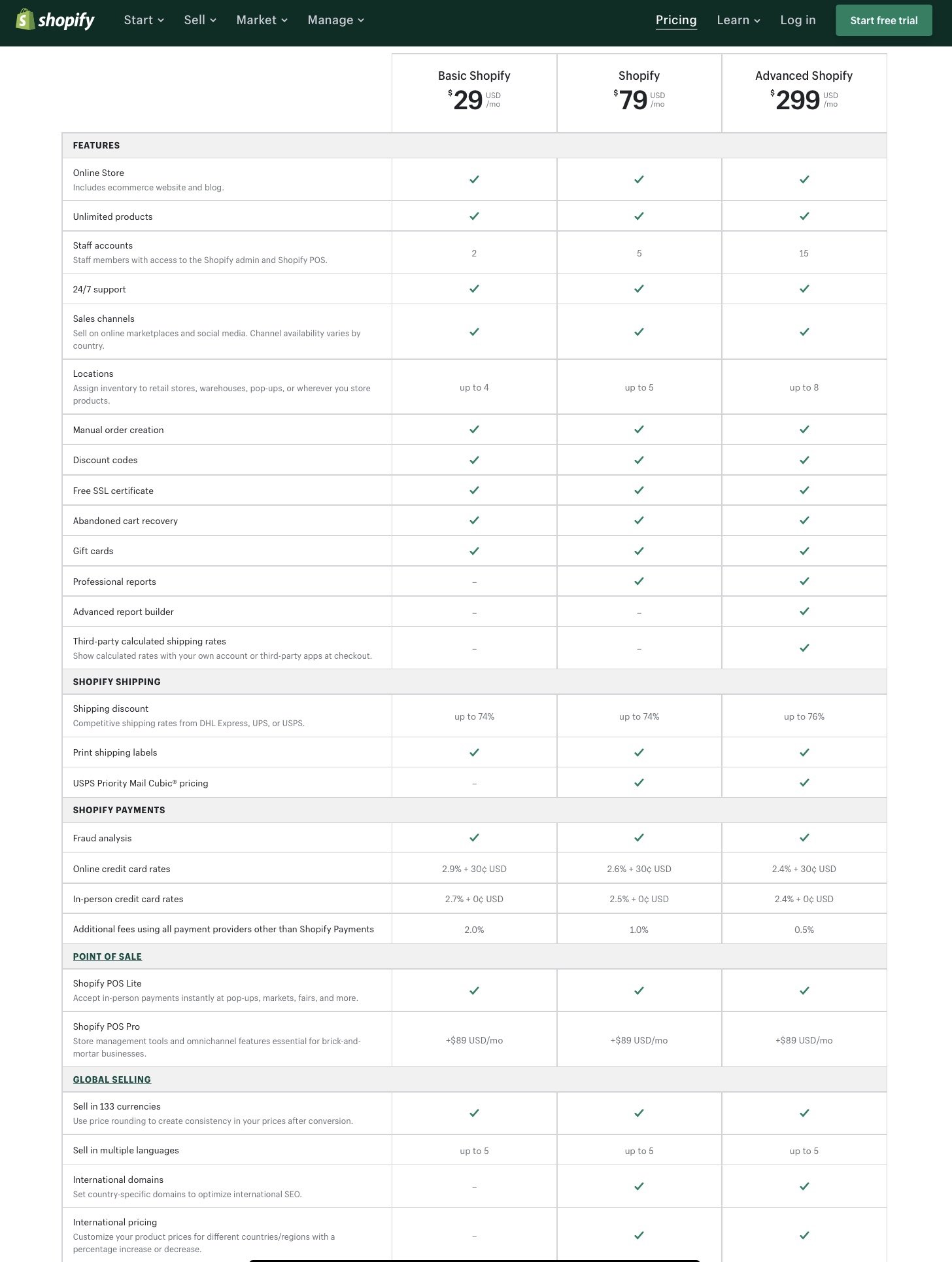 There’s the $29 base plan, plus the credit card processing rate of 2.9% + 30 cents on each transaction plus an additional 2% when not using Shopify Payments.