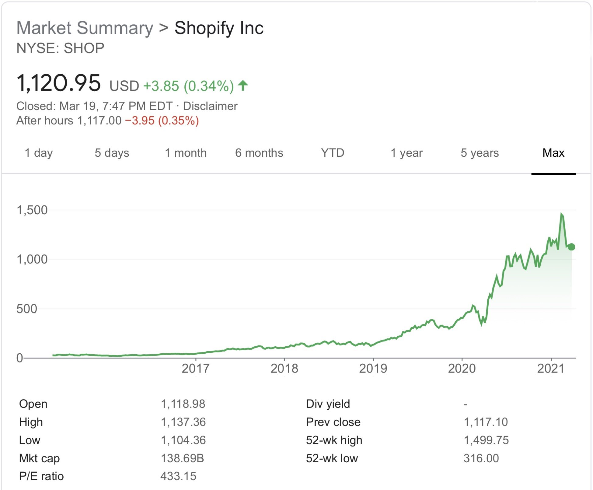 Shopify is huge, relatively agile and resilient. In Q4 2020, Shopify’s total revenue was $977 million, an increase of nearly $200 million from the previous quarter. The market has caught on, along with a pandemic fueled tech buying frenzy, and the stock has catapulted over the last year.